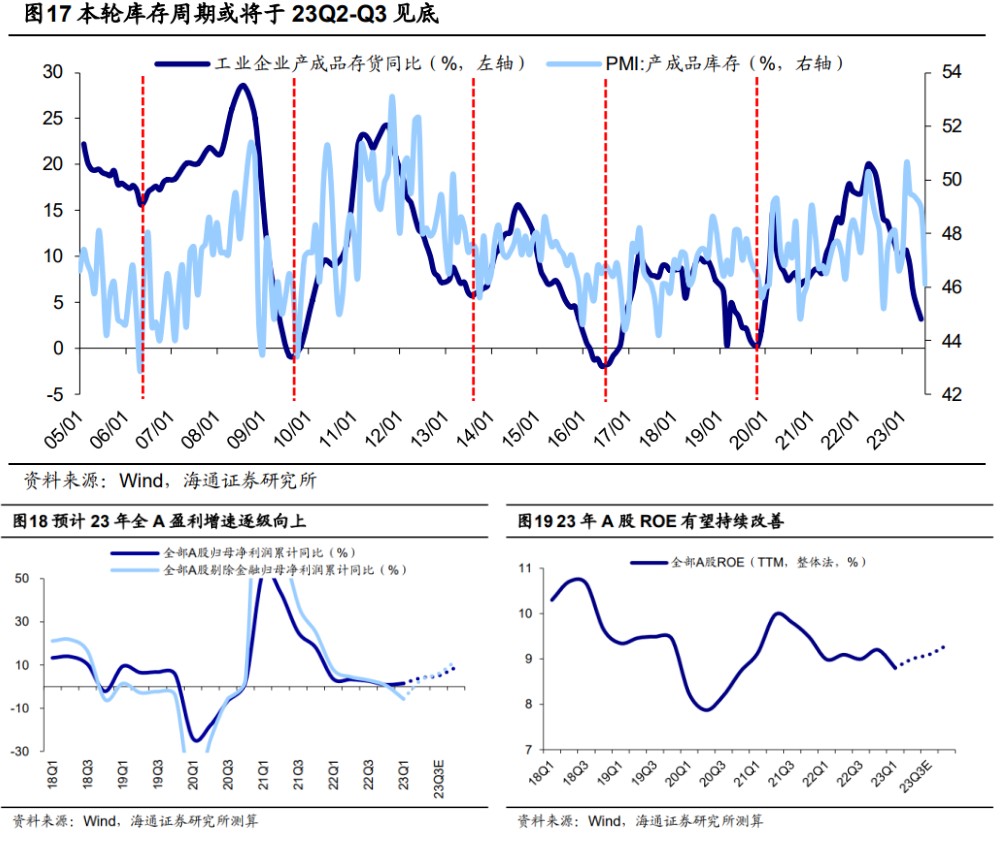 政事局会议后稳增长计策延续落地,关注后续计策落地收效情况。跟着724政事局会议的召开,稳增长信号开释明确,阛阓对计策关注度熏陶。近两周(23/08/07-23/08/18)以来阛阓举座走弱,主要源于投资者对计策力度及基本面复苏还存疑,因尔后续仍需关注稳增长计策落地收效情况,以及经济开拓情况。面前稳增长计策正延续落地,8月16日国务院总理主旨召建国务院第二次全体会议,提议“要效力扩大国内需求,络续拓展扩耗尽、促投资计策空间”。下半年跟着我国稳增长计策发力及经济周期见底回升,投资者对经济和盈利的预期有望回暖,进而使阛阓重回基本面驱动。同期,咱们以为下半年库存周期的见底回升是驱动我国经济开拓的宏大能源,把柄历史咱们算计本轮库存周期或将于23Q2-Q3见底,详见《库存周期的位置及行业各异-20230722》。跟着库存周期见底回升,咱们展望经济增长有望提速,全年GDP同比增速有望达5.3%。在经济回暖的布景下,咱们展望Q2-Q4 A股盈利将稳步复苏,23年全A归母净利润同比增速有望接近10%。