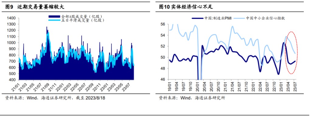 面前阛阓信心不足,活跃阛阓或能扭转经济预期。近期阛阓信心昭彰偏弱,股市成交量连忙萎缩,截止2023/8/18,一起A股成交量已下滑至659亿股,较724政事局会议后的高点萎缩34%。从阛阓发达看,近期各大股指已再次走弱,上证综指自政事局会议后高点最大跌幅-6%,沪深300为 -7%,已实足回吐了政事局会议后的最大涨幅。阛阓情绪回落也反应着面前对实体经济的信心仍不足,本年2月以来PMI呈现回落,7月PMI为49.3%,仍在相对低位。从企业乡信心看,中小企业信心指数也自3月的高点53.7下滑至7月的50.7。
