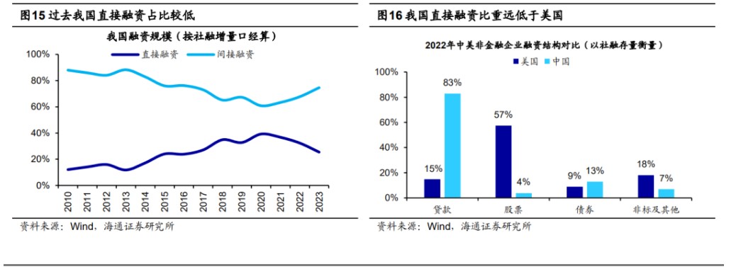 比年来我国老本阛阓积极处事经济结构转型升级,但金融体系中奏凯融资占比仍有较大熏陶空间。老本阛阓对实体经济的转型和发展中阐扬了宏大的作用:从股市结构看,自19年注册制雠校试点鼓舞下,我国优质新兴产业在A股占比昭彰熏陶,代表高质地发展的新经济板块(包括科技、生物医药、新能源等硬科技标的)在A股总市值中的占比已由19年头的21%高涨至32%。从融资结构看,面前我国奏凯融资比重已有显贵熏陶,奏凯融资在我国社融增量中的比重由10年的10%熏陶至20年的高点39%。但从国际比拟的视角来看,面前中国奏凯融资的比重尚且较低,仍有较大的熏陶空间。以社融存量估量,2022年股票、债券等奏凯融资格式在好意思国非金融企业融资结构中的占比达66%,而我国仅为17%,其中股市融资仅占4%。