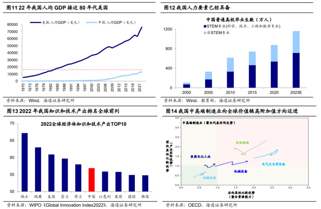 面前我国产业结构升级已具备了一定的基础:第一,老自身分方面,面前我国东谈主均GDP已接近80年代好意思国,从总量看我国已是寰球第二大经济体,22年我国GDP占寰球比重达18%。第二,东谈主力老本方面,我国东谈主才红利正在崛起,教师部展望2023年我国庸碌高校毕业生数为1158万东谈主,其中工科类专科占比达62%,我国的工程师红利将得以不停强化。第三,本事蚁合方面,我国本事产出不停熏陶,把柄WIPO的《Global Innovation Index 2022》,22年我国学问和本事产出名次还是高居寰球前哨,高于日本、德国、英国等发达国度。我国在新能源、5G等产业中已取得了先发上风,中高端制造在寰球价值链中的地位也不停攀升。